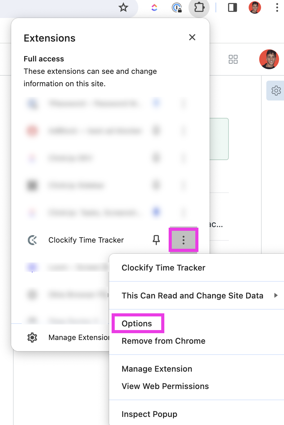 Clockify の統合で問題が発生している場合は、Clockify Chrome 拡張機能の設定でClickUpが承認されていることを確認してください。